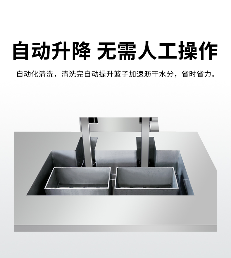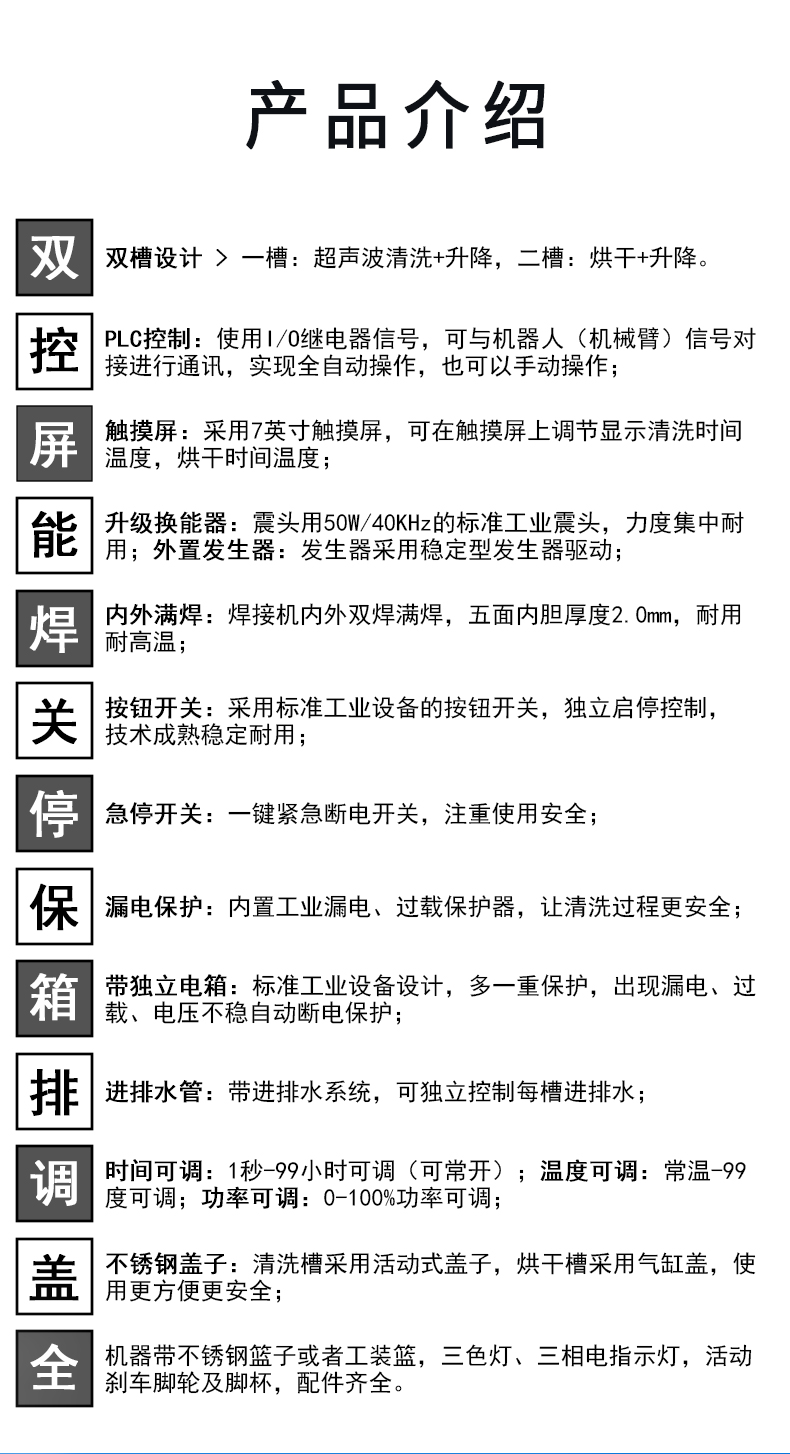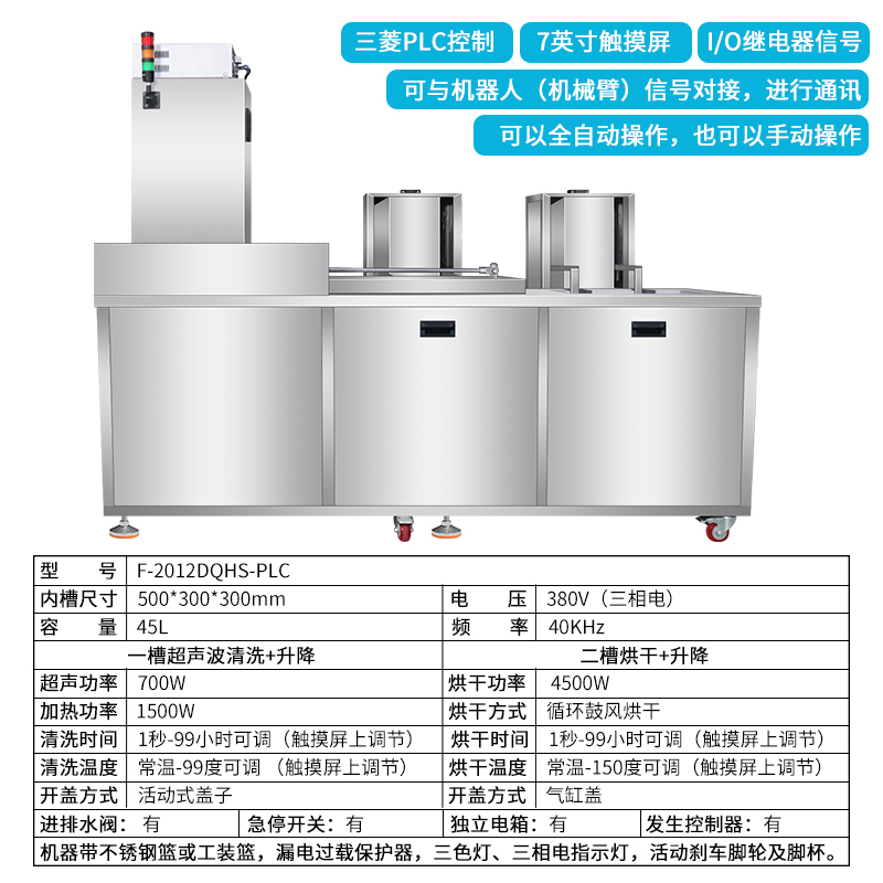 - 一槽:超声波清洗+升降;二槽:烘干+升降