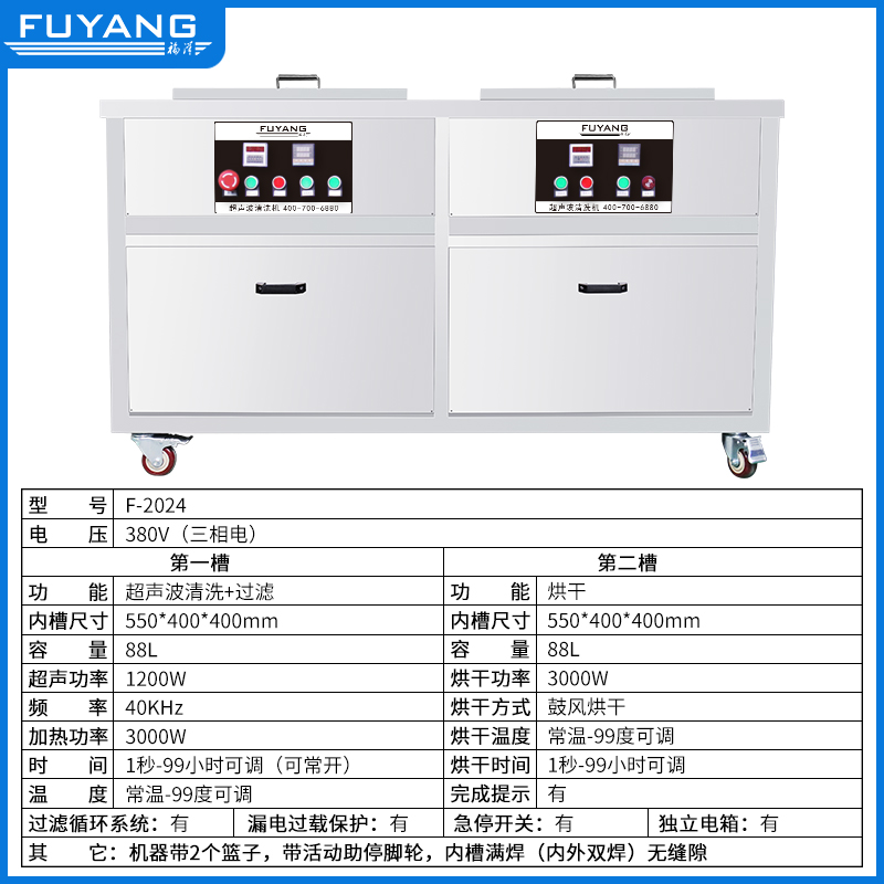 F-2024 | 88L 1200W 工业双槽带过滤循环超声波清洗机(可定做)