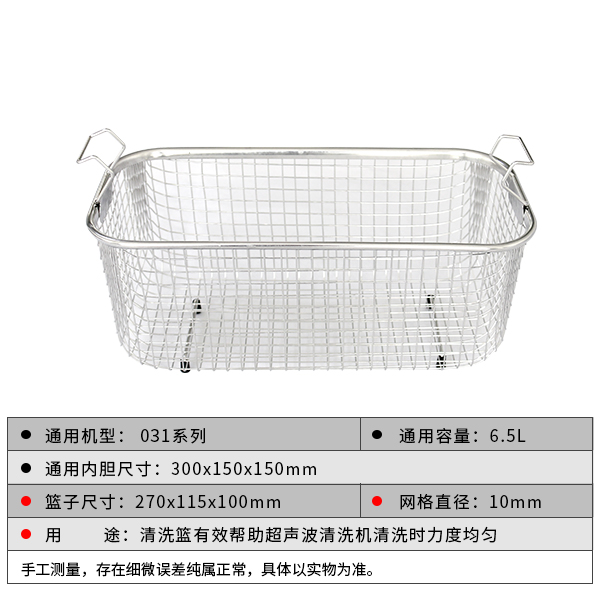 福洋6.5L清洗篮 | 031系列清洗篮 | SUS304不锈钢 2019/11/29 产品中心工业用系列 1511 规格参数 通用机型:031系列 通用容量:6.5L 内胆尺寸:300*150*100mm 篮子尺寸:270*115*100mm 网格直径:10mm 产品用途:使超声波清洗机在清洗时力度更均匀 咨询在线客服询价