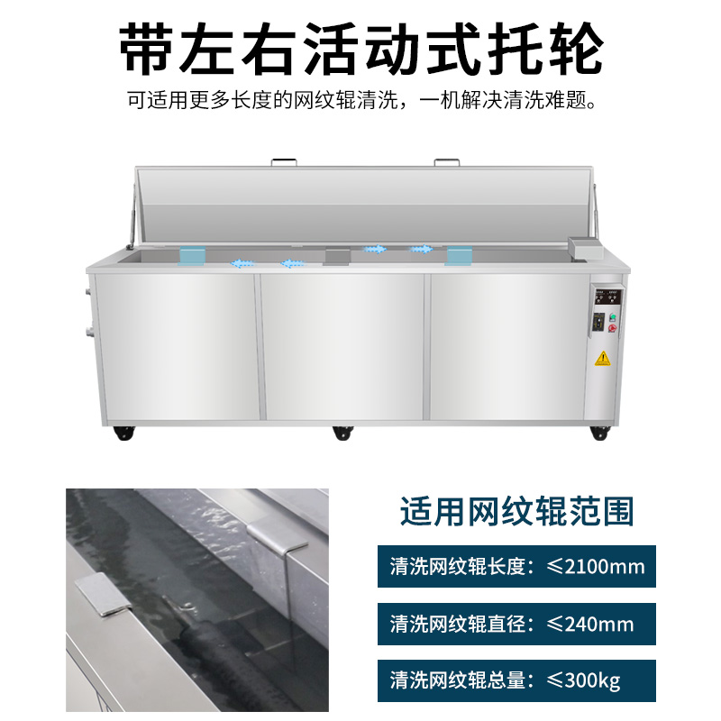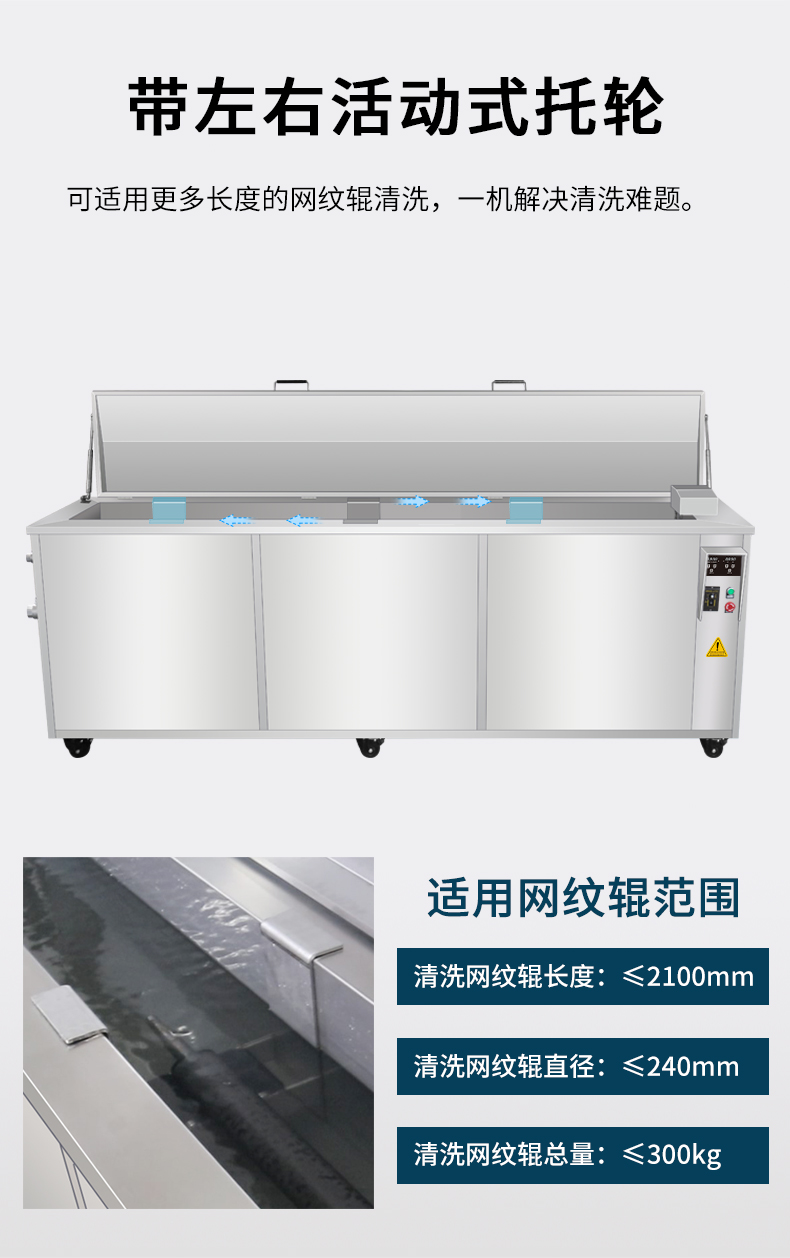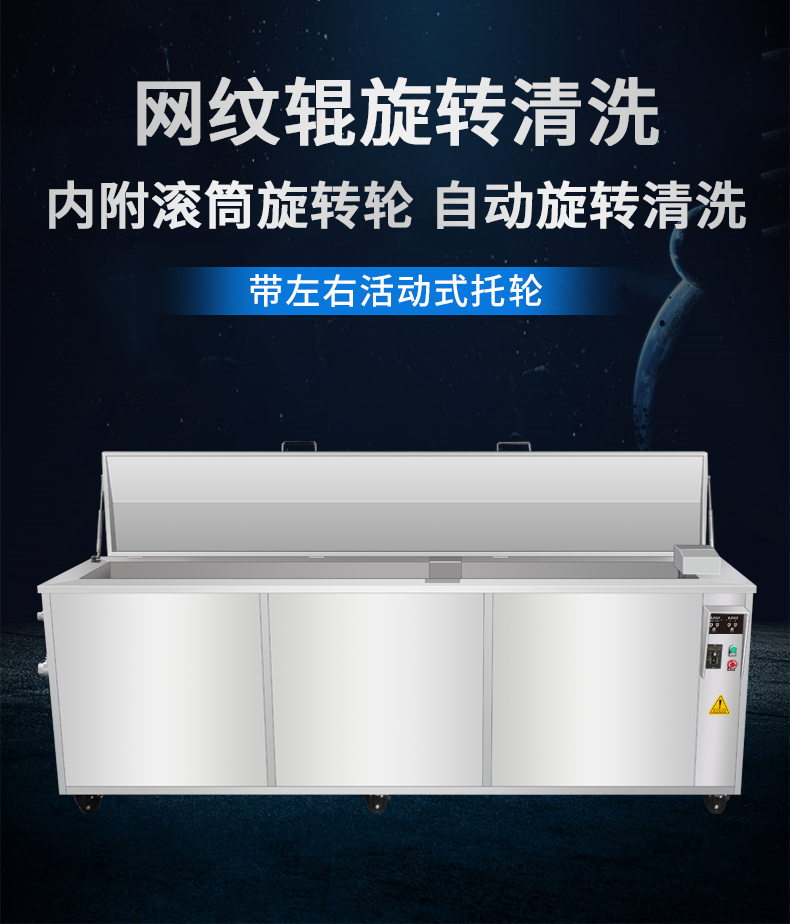 2.机器内槽加入清洗液,把网纹辊放到托轮上;